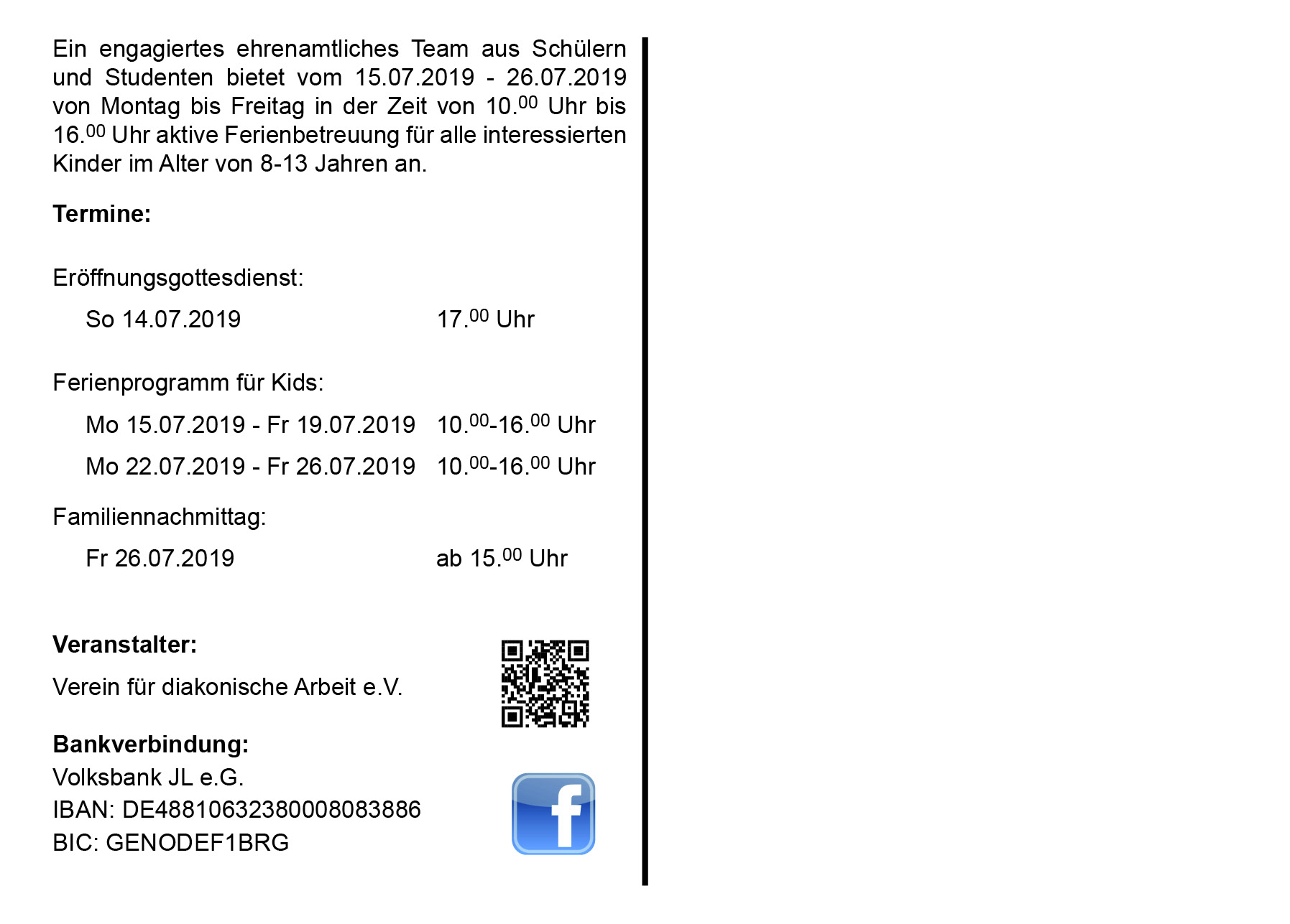 Heute Mitarbeiterstart und Eröffnungsgottesdienst (17.00 Uhr), ab morgen Aktionsstart für alle Kinder zwischen 8 und 13 Jahren. Willkommen und tolle Ferien!
